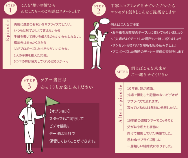 当社は、これまで海洋散骨やStory(お別れ会プロデュース)の施行のご依頼を受けてプランをコーディネートするサービスを展開してきました。しかしながら、よりお客様目線で考えた際に、散骨の当日前後で宿泊される方も多く、移動も現地集合・現地解散という商品しか提供できていないことに気がつき、旅行業の免許を取得し旅行サービスを展開することを決断いたしました。既存事業とのシナジーも高いため、より旅行を活用した終活ニーズが高まると考えています。法要や1周忌、3回忌、還暦イベントを行うことは勿論、旅先で大切な人に記念品を贈る、思い出をサプライズする、など、旅行を通してご縁や絆が深まる世界観が創るのではないかと思っています。本サービスでは、将来的には入院先や介護施設先からでも体験できる「VR(バーチャル)旅行」なども検討していきたいと思います。