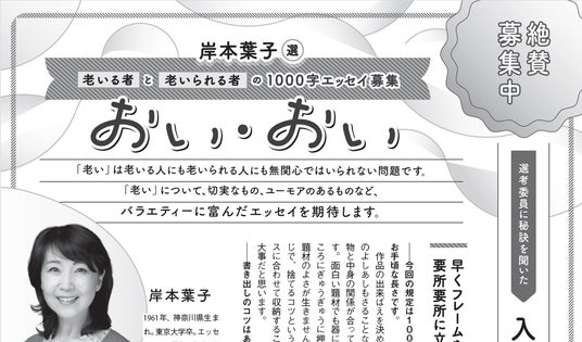 岸本葉子選 1000字エッセイ公募「おい・おい」老いる人も老いられる人も無関心ではいられない「老い」をテーマに、切実なもの、ユーモアのあるものなどバラエティーに富んだエッセイを募集。雑誌では、選考を務める岸本葉子さんにエッセイの秘訣を伺いました。
