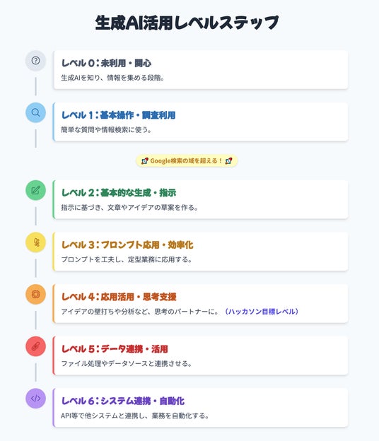 そこで、当社ではハッカソン実施に向け、活用段階を7つに整理した「生成AI活用レベル」を独自に定義。