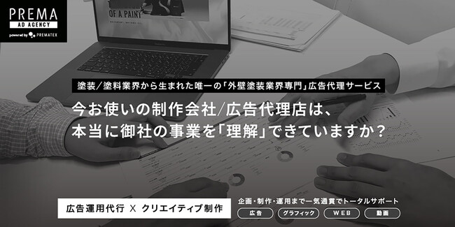 住宅用塗料の開発・製造・販売を行うプレマテックス株式会社(本社:東京都江東区 https://www.prematex.co.jp/)は、クリエイティブ制作から広告運用まで一貫提供する新サービス「プレマ・アドエージェンシー」を2023年6月より開始いたします。本サービスはクリエイティブの内製化~広告の自社運用により蓄積された経験とノウハウを最大限に活用し、お客様へ貢献する、外壁塗装/塗料業界に特化したビジネスサポートサービスになります。