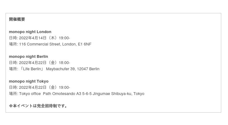 東京発のクリエイティブエージェンシー・株式会社monopo(以下、monopo)は、2年ぶりとなる完全招待制のパーティー「monopo night 」の開催を2022年4月22日(金)に決定いたしました。2022年4月14日(木)はイギリス・ロンドン、4月22日(金)にドイツ・ベルリンで開催となり3都市で同月開催は今回が初めての試みです。