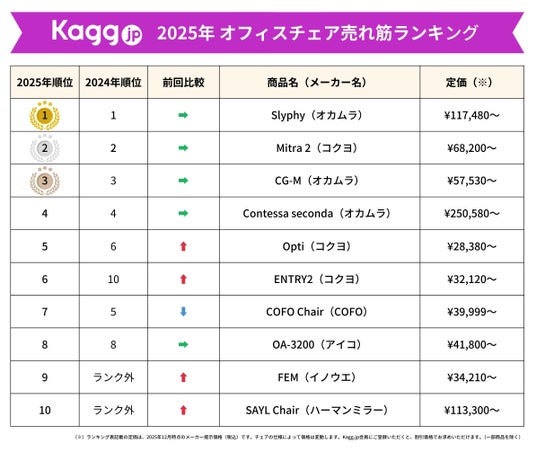 (※)ランキング表記載の定価は、2025年12月時点のメーカー提示価格(税込)です。チェアの仕様によって価格は変動します。Kagg.jp会員にご登録いただくと、割引価格でお求めいただけます。(一部商品を除く)