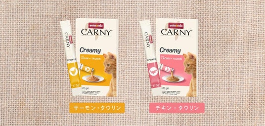 「カーニー クリーミー」でも、猫ちゃんに嬉しい要素として、どちらの味にも猫の必須栄養素であるタウリンを配合。おやつでありながら猫に必要な栄養素を摂れる嬉しいおやつとなっています。