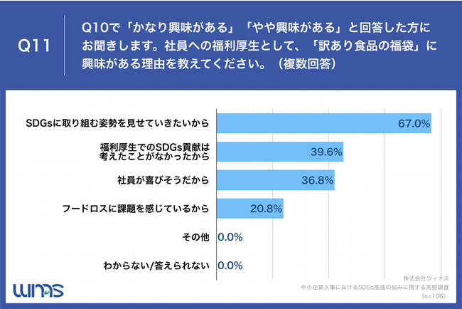 Q10で「かなり興味がある」「やや興味がある」と回答した方に、「Q11社員への福利厚生として、「訳あり食品の福袋」に興味がある理由を教えてください。(複数回答)」(n=106)と質問したところ、「SDGsに取り組む姿勢を見せていきたいから」が67.0%、「福利厚生でのSDGs貢献は考えたことがなかったから」が39.6%、「社員が喜びそうだから」が36.8%という回答となりました。