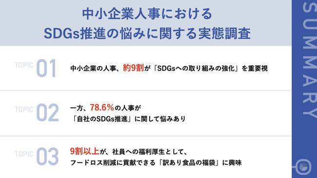 今回の調査では、自社のSDGs推進が重要と感じているものの、取り組みを社内外に表現するのが難しいなどといった悩みを抱える人事担当者が多くいらっしゃることが明らかになりました。多くの方が、自社のSDGs推進の一環として、フードロス削減に貢献できる「訳あり食品の福袋」に興味を示していることから、社員の健康づくりのための福利厚生として取り入れるところから、SDGs推進を始めてみるのはいかがでしょうか。