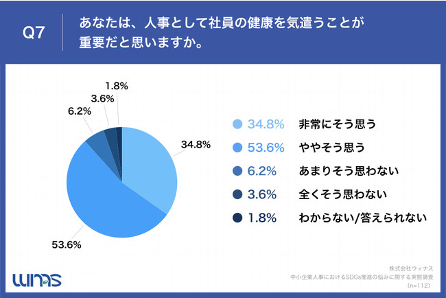 「Q7.あなたは、人事として社員の健康を気遣うことが重要だと思いますか。」(n=112)と質問したところ、「非常にそう思う」が34.8%、「ややそう思う」が53.6%という回答となりました。