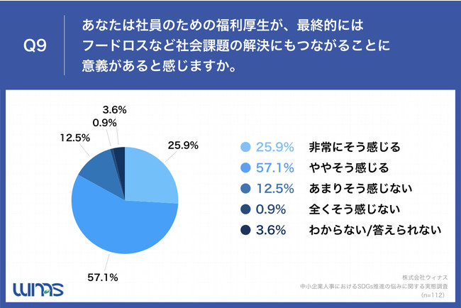 「Q9.あなたは社員のための福利厚生が、最終的にはフードロスなど社会課題の解決にもつながることに意義があると感じますか。」(n=112)と質問したところ、「非常にそう感じる」が25.9%、「ややそう感じる」が57.1%という回答となりました。