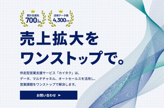 カイタクは法人向けの伴走型営業支援サービスです。「よいサービス・製品を作っているのに売上が伸び悩んでいる」そんな企業様の課題をワンストップで解決します。