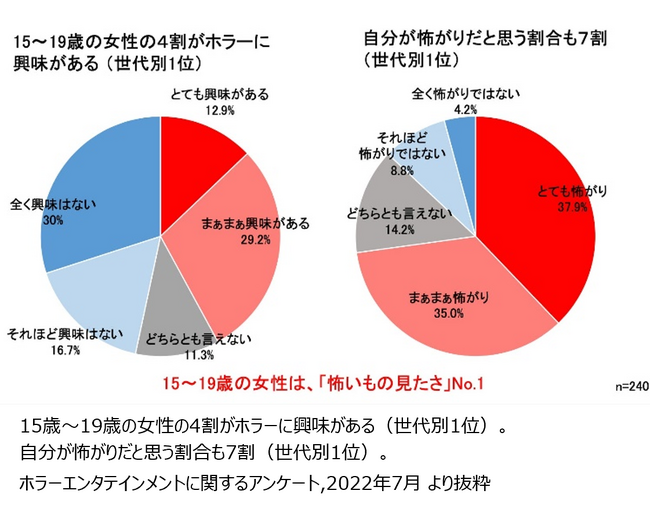 近年、「ホラー」のジャンルも多角化してきており、アニメやゲームをはじめとするホラーコンテンツが増えてきています。闇と東洋学園大学の現代経営学部教授でフリーアナウンサーの八塩圭子氏がZ世代を対象に実施した調査(2022年7月)において、ホラーエンターテインメントにもっとも興味がある年齢層は15~19歳女性という結果になりました。また、その層では女性は自分が怖がりだと思う割合も7割を超え、ホラーに興味がある割合は年齢が若いほど高く、年齢が上がるにつれて、低下していく傾向にあります。ホラーコンテンツの多様化が加速する中、今後さらにZ世代が「ホラー消費」を牽引していくと予想されています。
