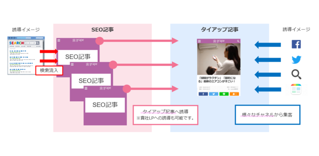 商材に関連するキーワードでSEO記事を作成し、訴求ポイントを盛り込んだタイアップ記事に誘導。
