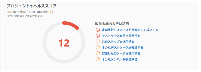 プロジェクトのヘルススコアを100点満点で、また改善の余地が大きいと考えられる項目を一覧で表示します。