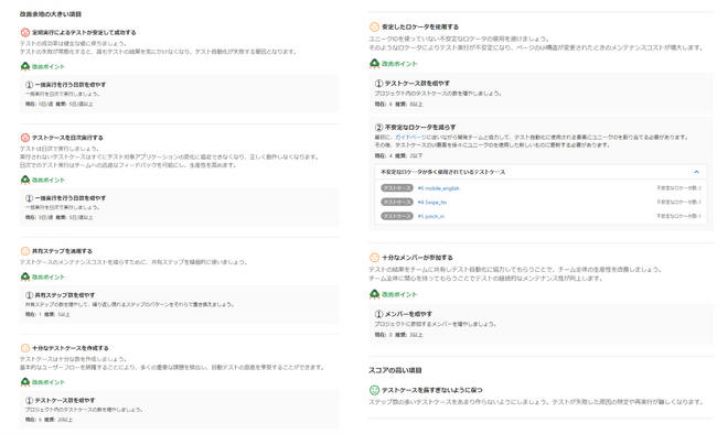 ヘルススコアの計算ロジックには、MagicPodがこれまで多くのユーザーのテスト自動化を支援していく中で得たノウハウが組み込まれています。こうしたナレッジによって導き出された改善提案に誰でも簡単にアクセスできます。