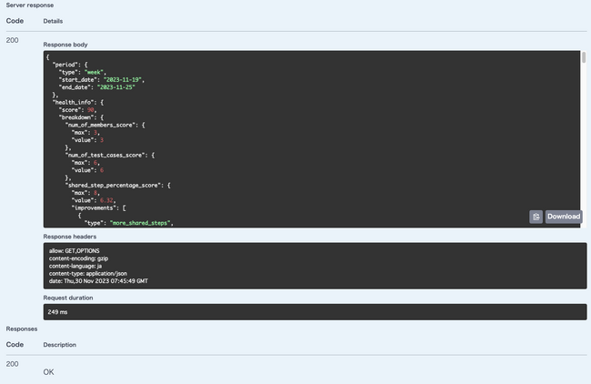 画面から確認できるのと同じヘルススコア及び改善提案の内容をMagicPodのWeb APIで取得することも可能です。Web APIを使うことで、ヘルススコアの内容をユーザー自身のチャットスペースに通知したり、ユーザー自身のダッシュボードに組み込んだりすることができます。