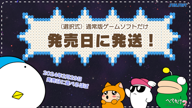 サンソフト(サン電子株式会社)では、「へべれけ2」『32年くらいぶりの復活記念特別版』の発売を決定し、本日12月14日(木)11:00より、サンソフト公式オンラインショップ(URL:https://sunsoft.official.ec/)にて予約開始したことをお知らせいたします。