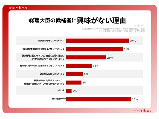 「特に理由はない」と回答した人が35%と最も多く、次いで「自民党を信頼していないから」が34%、「今回の候補者に魅力を感じる人物がいないから」が31%、「誰が総理大臣になっても、自分の生活や社会に大きな影響がないと思っているから」が22%、「総裁選の選挙制度に問題があると感じているから」が14%、「政治全般に関心がないから」が9%、「候補者同士の討論会などがなく、候補者や政策について十分な情報がないから」が8%、「その他」が3%という結果になりました。