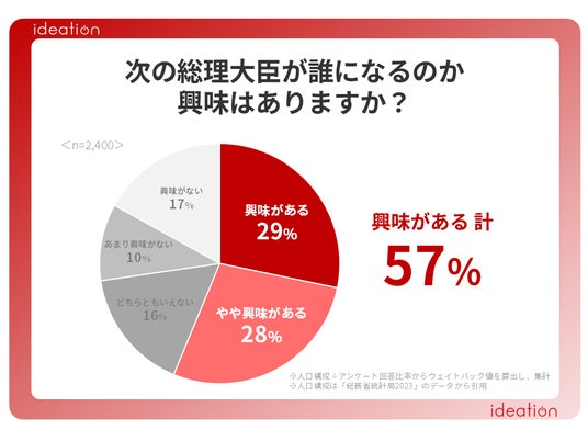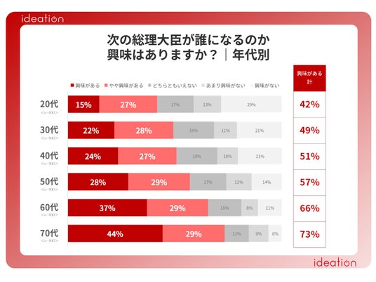 また、30代以下では「興味がある」「やや興味がある」と回答した人が半数を切り、年齢が若くなるほど次期総理大臣への関心度が低くなっていく傾向が顕著になりました。
