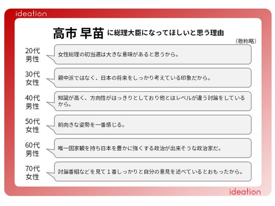 高市早苗氏を支持する理由として、初の女性総理への期待や、日本の方向性をしっかりと考えている前向きな姿勢を期待している声などがあがりました。