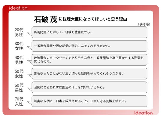 石破茂氏を支持する理由として、防衛問題や裏金問題など様々な問題にも真正面から取り組む姿勢を感じさせる人柄や、経験の豊富さから期待をしている声などがあがりました。