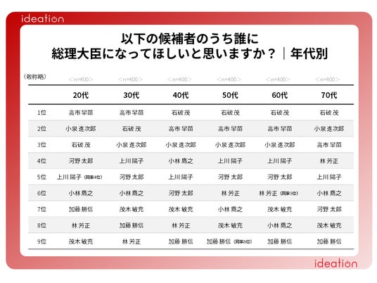 どの年代でも「石破 茂氏」「高市 早苗氏」「小泉 進次郎氏」がTop3を占める結果となりました。