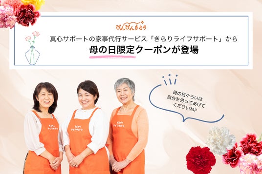 家事代行やベビーシッターの枠を超えて幅広く依頼できるご家庭サポート「きらりライフサポート」を運営する株式会社ぴんぴんきらり(本社:東京都品川区、代表:喜多尾 衣利子)は、2025年4月22日(火)~2025年5月11日(日)の期間にお問い合わせいただいた新規ご利用希望の方に限り、入会金が無料になる母の日限定クーポンが登場しました。