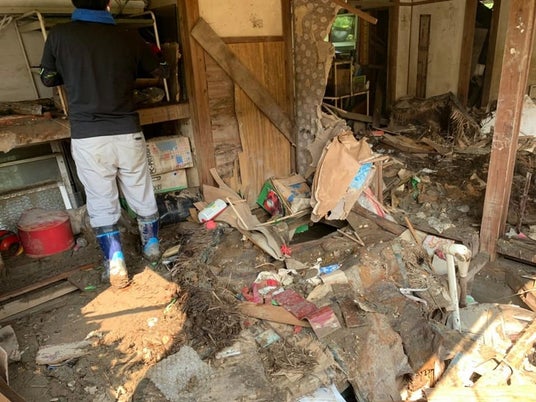 暑くても長袖長ズボンで作業をし、破傷風などにも配慮しながら作業を行います。たくさんの人手が必要です。(2020年7月19日、人吉市で活動している時の様子)