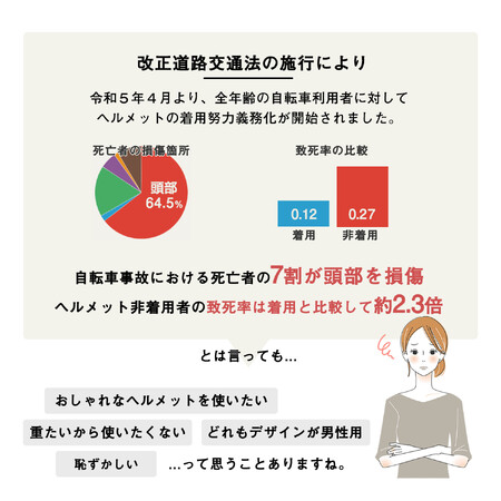 2023年の道路交通法の法改正(※1)により、自転車を利用する全ての人にヘルメット着用の努力義務が定められました。この法改正により子ども用だけでなく大人用のヘルメットにも注目が集まり、自転車乗車中にヘルメットを着用している大人を街中で目にする機会も少しずつ増えてきました。