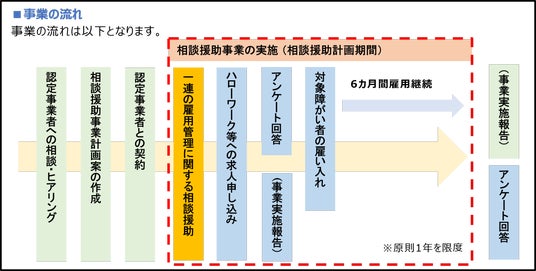 都道府県労働局長の認定を受けた事業者が障がい者雇用の経験やノウハウが不足する事業主に対して、雇入れやその雇用継続を図るための一連の雇用管理に関する相談援助をおこないます。