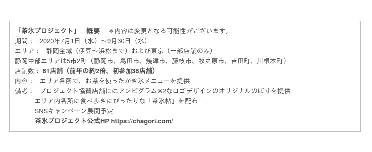 3年目となる2020年は、静岡県中部だけでなくエリアを超えて発展・進化。東は伊豆から西は浜松に至る広域にて、昨年の倍以上となる61店舗(初参加38店舗)から、それぞれこだわりの個性的な「茶氷」メニューを提供しており、今年は開始から1か月で約18,000食を売り上げました。