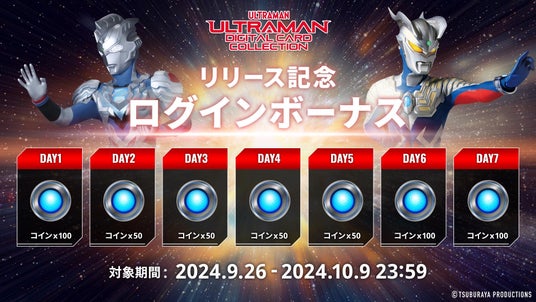 キャンペーン期間中、アプリ「ウルトラマン デジタルカードコレクション」に合計7日間ログインすると、最大でデジタルカード30枚分のアプリ内コインをプレゼントする特別なログインボーナスキャンペーンを開始しました。アプリを利用して、デジタルカードを手に入れてください。