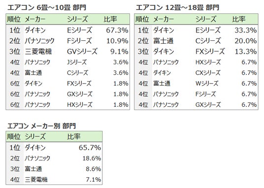 エアコンランキングの3部門、6畳~10畳(ワンルーム・小部屋用)、12畳~18畳(リビング用)、メーカー別の全部門で1位をダイキンが独占しました。シリーズ別ランキングはどちらも、ダイキンで最もお手頃価格であるEシリーズが1位を獲得。6畳~10畳部門では7割近いお客様がEシリーズを購入されました。