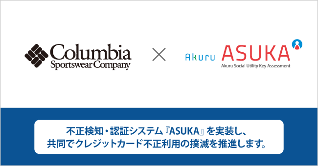 クレジットカードの不正利用対策ソリューションを提供する株式会社アクル(所在地:東京都港区、代表取締役社長:近藤 修、以下「当社」)は、株式会社コロンビアスポーツウェアジャパン(所在地:東京都新宿区、代表取締役社長:ラッザリ・マッスィモ、 以下「コロンビアスポーツウェアジャパン」 )と共同で、コロンビアスポーツウェアジャパンが運営する「Columbia」サイトへの「ASUKA」提供を含めたセキュリティ強化により、クレジットカード不正利用の撲滅を推進します。