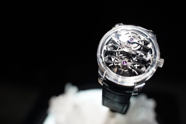ています。輝くトゥールビヨンは現代的な精神を以て、全体が透明なサファイアクリスタルで作られたケースとともに光のスペクトルに入り込みます。