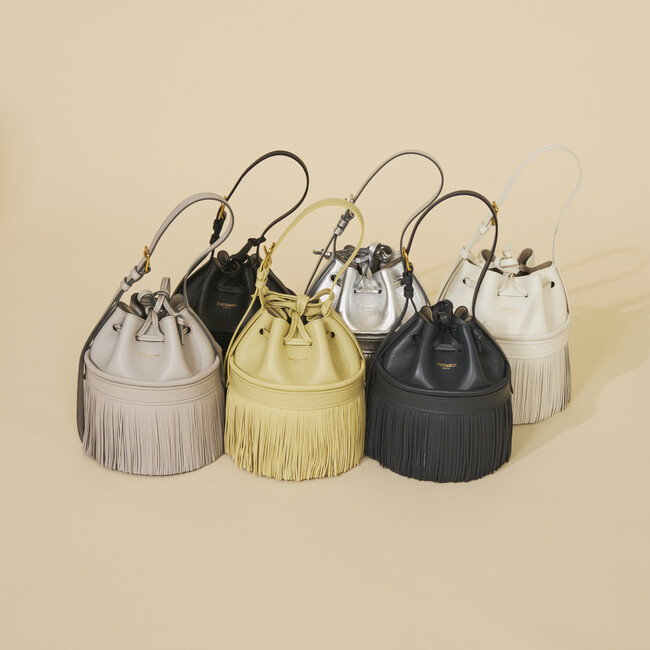 リュクスな雰囲気を纏った柔らかなカーフレザーと、歩くたびに揺れ動く繊細なフリンジ。ボディ中央に配したバンドにマークされた、ループ状のフリンジも小気味良いアクセントに。ストラップには、J&M DAVIDSONのルーツである「ベルト」のゴールドバックルが付き華やかさもプラス。