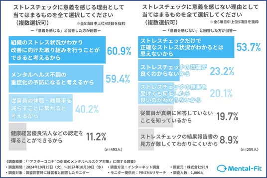 ストレスチェックを通じて組織全体の健康管理や予防対策を強化したいと考える経営者や、従業員の休職や離職率の減少に繋がると考える経営者が多いことが判明した。
