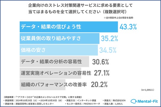 企業向けのストレス対策関連サービスに求める要素については、43.3%が「データ・結果の信ぴょう性」、35.2%が「従業員側の取り組みやすさ」、34.5%が「価格の安さ」と回答したことから、 信ぴょう性や実用性、コストパフォーマンスに優れたサービスを求めていることがわかった。