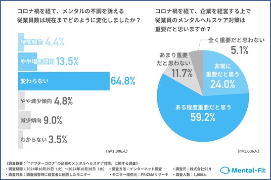 法人向けメンタルヘルスケア事業「Mental-Fit」を運営する株式会社SENが、経営者1,006人を対象に「“アフターコロナ”の企業のメンタルヘルスケア対策」に関する調査を実施しました。