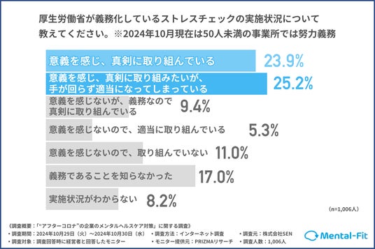 厚生労働省が義務化しているストレスチェックの実施状況について聞いたところ、23.9%が「意義を感じ、真剣に取り組んでいる」、25.2%が「意義を感じ、真剣に取り組みたいが、手が回らず適当になってしまっている」と回答。