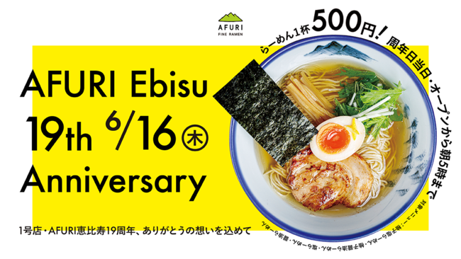 AFURI株式会社(本社:神奈川県厚木市、代表取締役社長:中村 比呂人)は、日頃よりAFURI恵比寿へご来店いただき、ご愛顧くださるお客様への感謝と、お召し上がりいただいたことのない方にもぜひ一度ご来店いただきたいとの思いから、19周年を迎えるAFURI恵比寿にて、通常1,080円でご提供中の看板メニューである『柚子塩らーめん』を1杯500円でご提供いたします。また、『柚子醤油らーめん』『塩らーめん』『醤油らーめん』も同じく500円でご提供いたします。