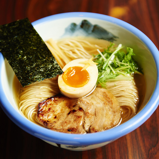 AFURIの看板メニュー『柚子塩らーめん』阿夫利山の天然水を用い、新鮮な鶏ガラと香味野菜、昆布や鰹節などの魚介類を丁寧に抽出したスープ。特製の塩ダレは、フランス・ブルターニュ地方のゲランドの塩、瀬戸内海の藻塩、そして木樽仕込み・天然醸造の白たまり等の厳選した調味料をブレンド。麺は自家製の全粒粉入り極細麺。