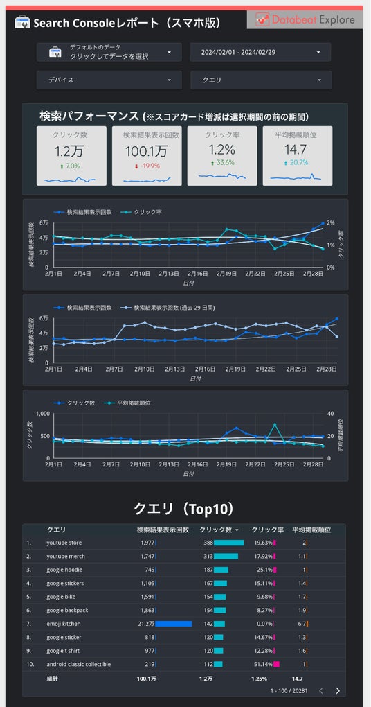 サーチコンソール対応版Looker Studioテンプレート(ダークテーマ)は、Databeatをご契約されていない方でも、無料でご利用いただけます。