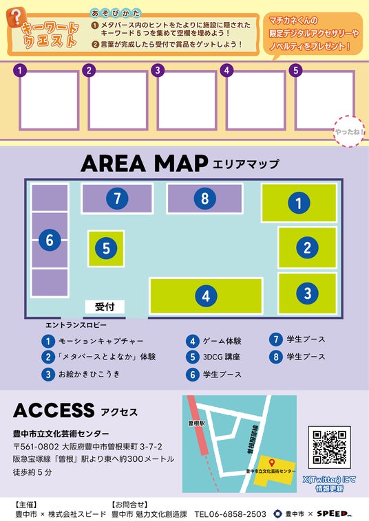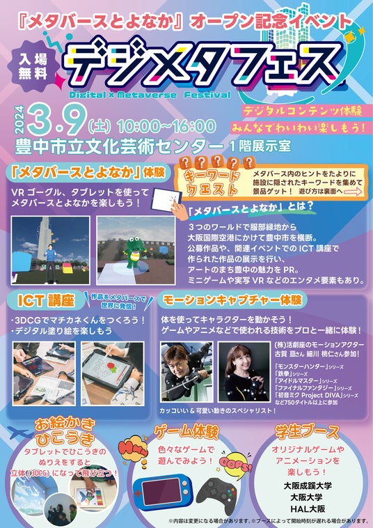また、同イベントではメタバース体験の他に、ゲームやアニメ、映画などで使われる技術モーションキャプチャーの体験を、(株)活劇座 代表取締役/モーションアクター、カッコいいのスペシャリスト古賀亘氏と、可愛いのスペシャリスト細川桃仁氏をゲストに招いて実施。体を使ってリアルタイムでアバターを動かそう!その他、立体になって飛び立つ飛行機のデジタルぬり絵、大阪府内の大学、専門学校による学生ブースの展示も実施予定。学生ブースでは、学生制作のオリジナルゲームや映像作品の視聴、3DCGデータに触れるといった体験をすることが可能。また、3DCGでマチカネくんをつくろう!講座も実施(事前予約制。空きがあれば当日参加可能)。制作したマチカネくんは後日「メタバースとよなか」で展示。さらに、メタバース内にちらばめられたヒントをもとに、リアルのイベント会場を巡る「キーワードクエスト」も開催!クエストをクリアしてマチカネくんのデジタルアクセサリーやノベルティをゲットしよう!その他、ゲーム体験などなど、ぜひ足を運んで様々なデジタル体験をしましょう!主催は豊中市役所とクリエイティブカンパニー(株)スピード。イベント時間は10時~16時。WEBサイトを是非チェックしてみよう!