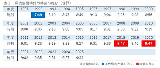 ・調査開始以降の世界全体の環境危機時計の時刻の推移では、1996年以降、2000年を除いて、常に9時台の「極めて不安」の領域を示している。(表1・図3)