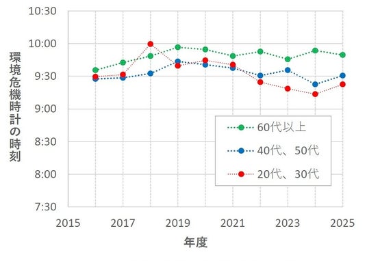 1.2 回答者の年代層による環境危機時刻の推移 (2016年~2025年)