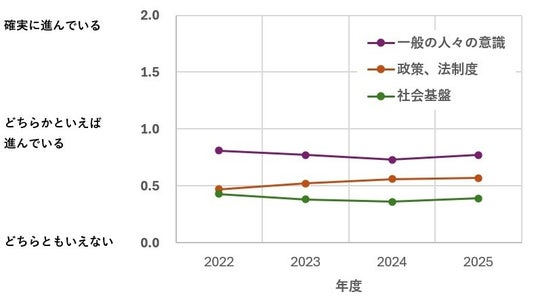 (「全く進んでいない」を「-2」、「どちらかといえば進んでいない」を「-1」、「どちらかといえば進んでいる」を「+1」、「確実に進んでいる」を「+2」として数値化し平均値を出した)。