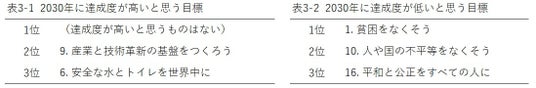 17ある持続可能な開発目標 (SDGs)の中で、2030年に達成度が高い・低いと思う目標をそれぞれ3 つ選んでもらった。上位の回答の3つの目標を表3-1, 3-2に示した。それぞれの地域、国ごとのデータは、「2025年調査報告書」に記載。