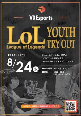 プロeスポーツチーム「V3Esports」のユースチームの『League of Legends』(以下:LoL)トライアウトが今年も実施されることとなった。2年前の夏行われた「League of Legends Japan League(以下:LJL)2020 Summer Split」で優勝を果たしたプロeスポーツチーム、「V3Esports」(以下:V3)。彼らはチーム強化、選手育成のため、学校法人神戸学園と連携してユースチームを始動させた。