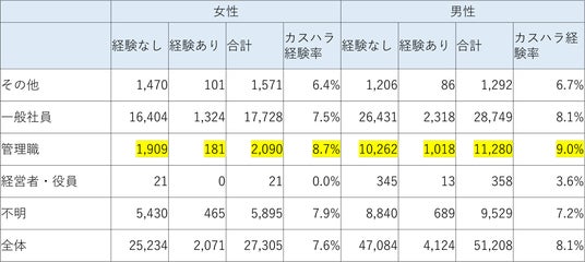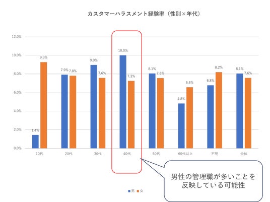 その結果、40代男性および管理職層において、カスタマーハラスメント経験率が相対的に高い傾向が確認されました。