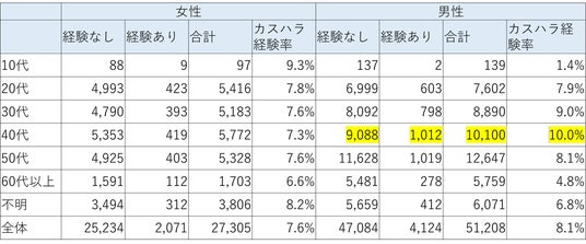 性別および年代別に分析した結果、40代男性においてカスタマーハラスメント経験率が最も高い水準を示しました。理由としては、クレーム対応の最終対応者となりやすい管理職に40代男性が多いことが考えられます。