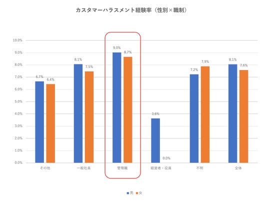 主な結果2. 管理職は男女ともにカスタマーハラスメント経験率が高い傾向