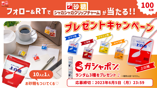 「スプーン印」「ばら印」のお砂糖でおなじみのDM三井製糖株式会社(本社:東京都港区、代表取締役社長 森本卓)は、ガシャポン「スプーン印シャカシャカクリップチャーム」の発売を記念して、プレゼントキャンペーンを2023年5月23日(火)より開始いたします。クリップチャーム全5種類は4月より全国のカプセル自販機で発売され、購入者からは、裏面まで忠実に再現された点など高評価をいただいています。